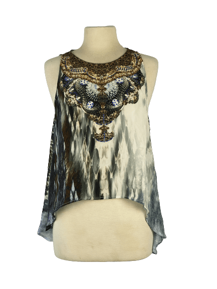 Camilla Silk Printed Top with Rhinestone Neck Detail