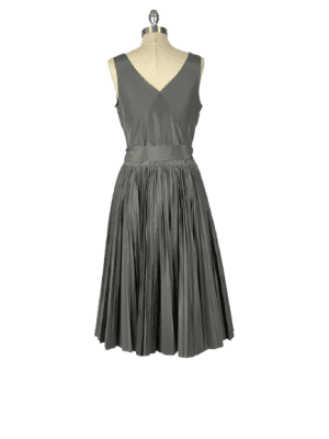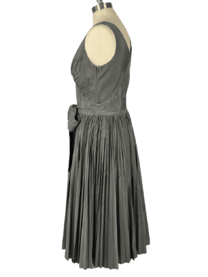 Steel-grey sleeveless silk polyester blend taffeta dress. Has permanent knife pleats, an invisible side zip with a hook closure, a tie belt, and pleated bust detailing. No flaws to note.