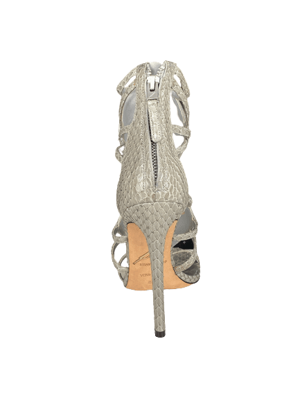 / Brian Atwood Grey Snakeskin Strappy Stiletto Sandals