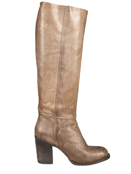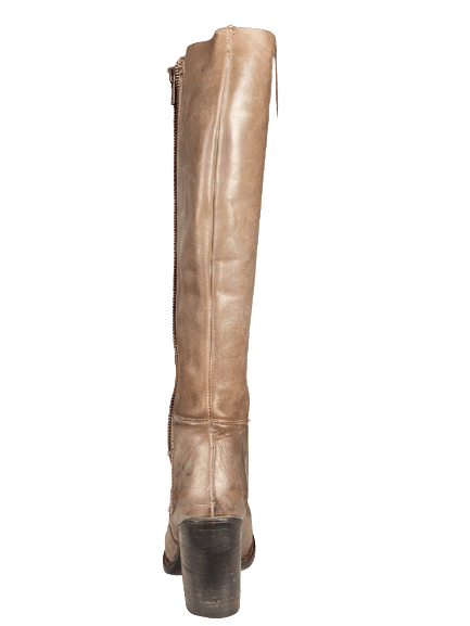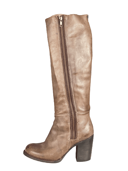 Distressed taupe tall leather boots. Stacked solid heel, chunky side zipper closure. Good condition, intended to look distressed.