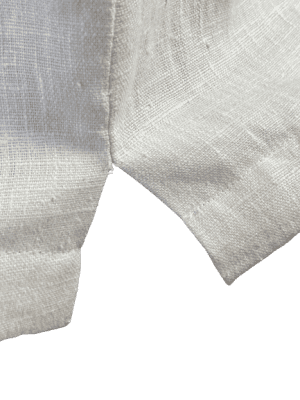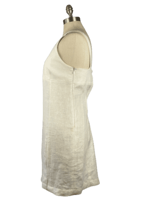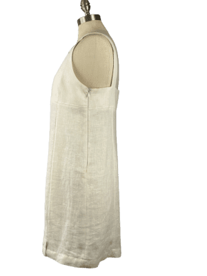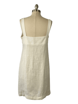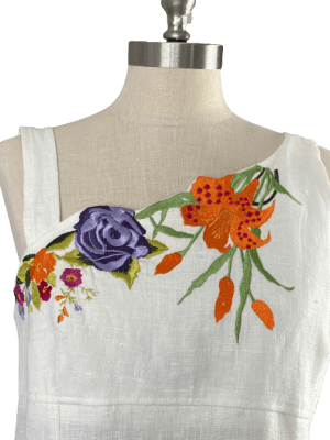 Cream linen sun dress/ asymmetric shoulder strap with floral embroidered neckline/side zip/ kick pleat/ can be lengthened