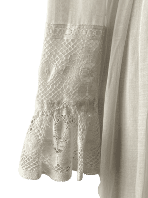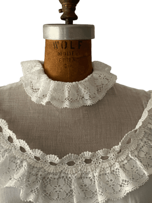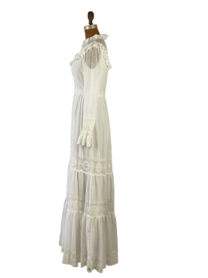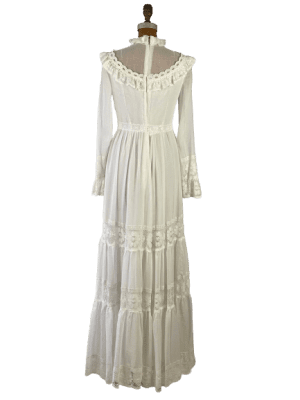 Vintage 1960s’s ethereal long sleeved tiered white bohemian wedding dress with lace detail/back zip closure with hook and eye/lined/waistband closes with hook and eye