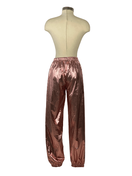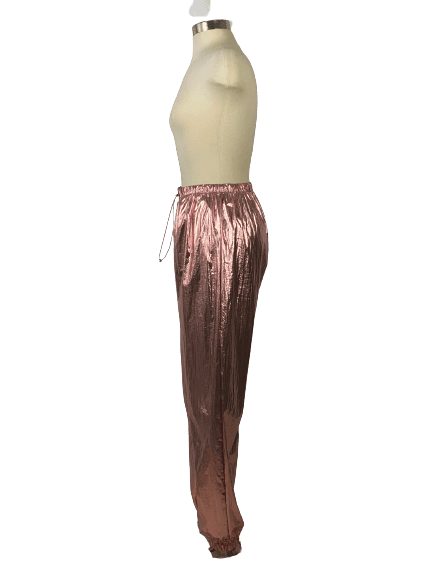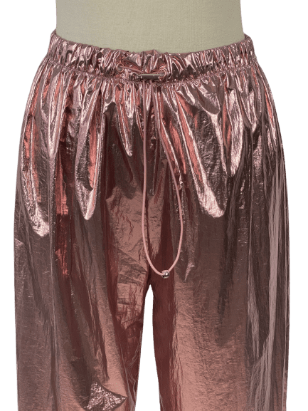 Pink metallic reflective nylon pants with elastic waist and bottoms, and waist pull tie. In good condition.