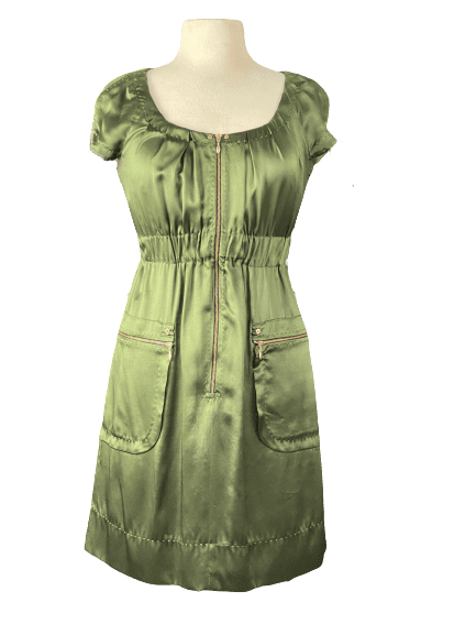 Olive silk dress with gold front accent zip closure. Front functional pockets. Scoop neck with cap sleeves. Good Condition.