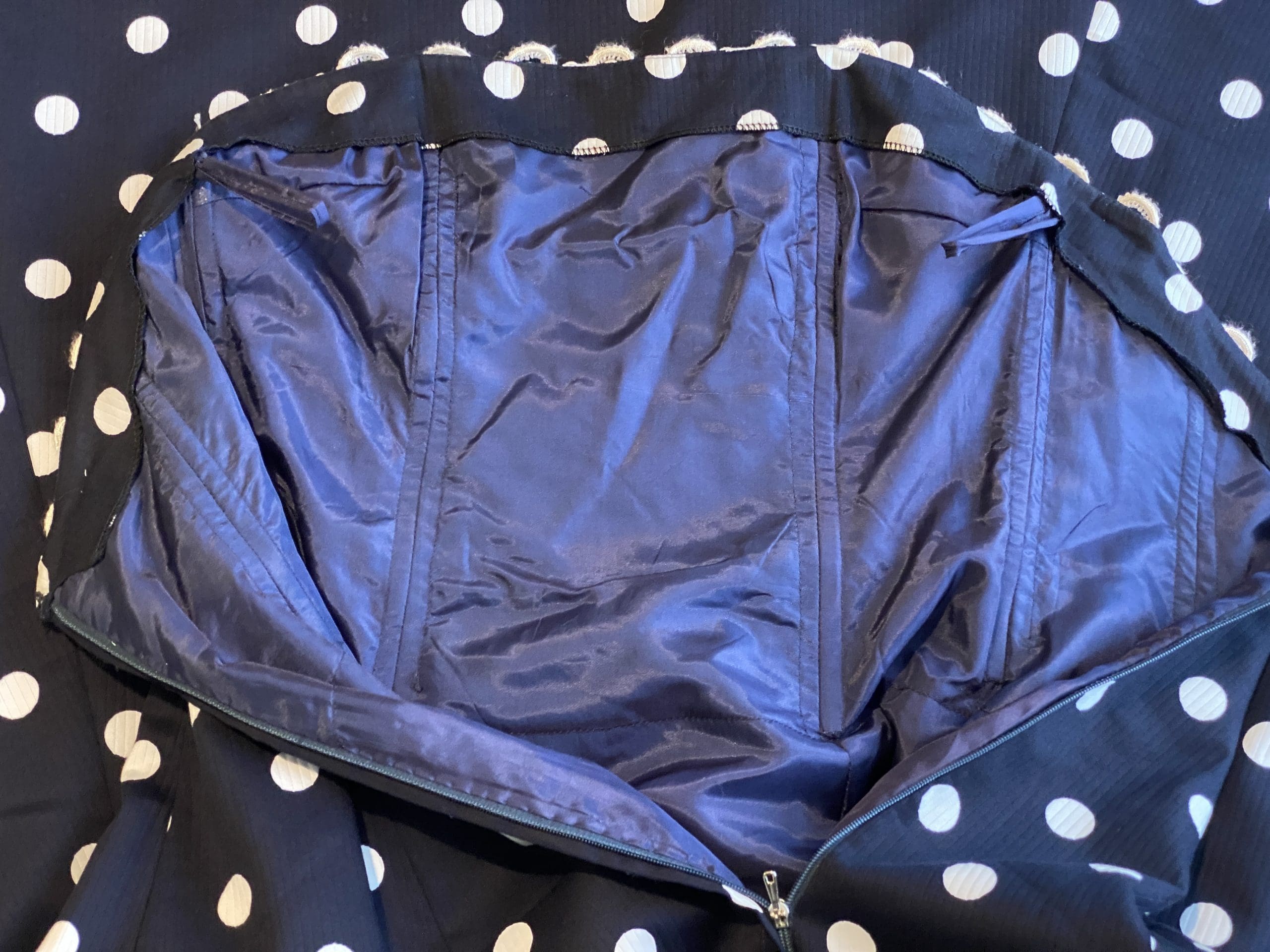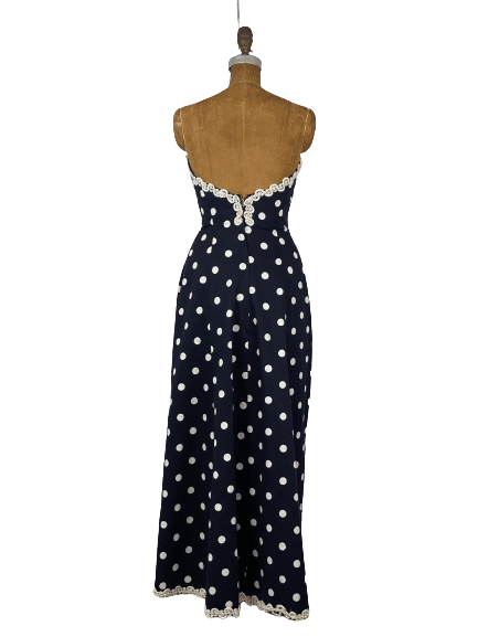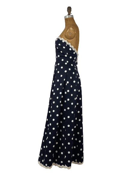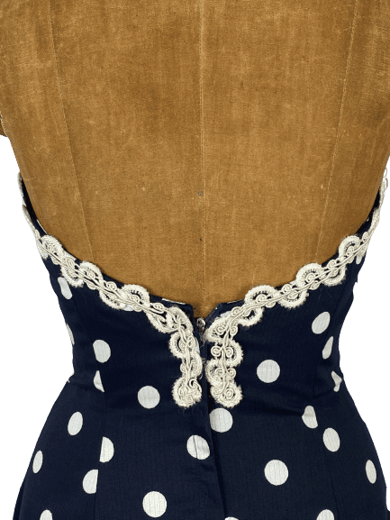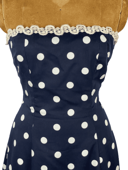 Dark navy blue polka dot print bustier fit and flare dress with a boned bodice and a back zip closure. Lace trim on neckline and hem. Fully lined. No flaws to note.
