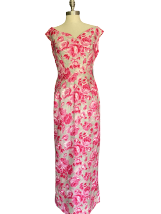 Maxi, light grey vintage silk twill gown  with pink rose print and a sweetheart neckline.  Back metal zip closure.Has a back kick split. ILGWU tag. Good vintage condition, note a small fray on shoulder and a few stains that are hardly noticeable.