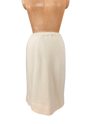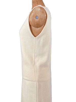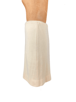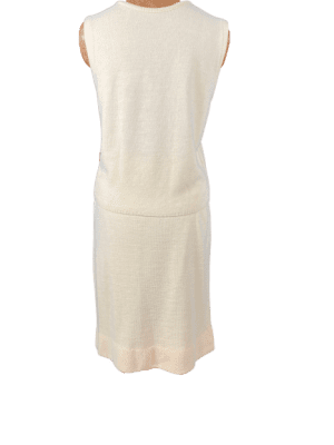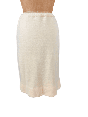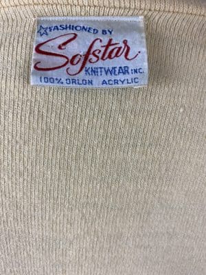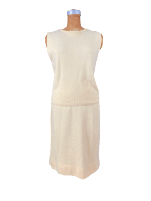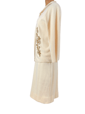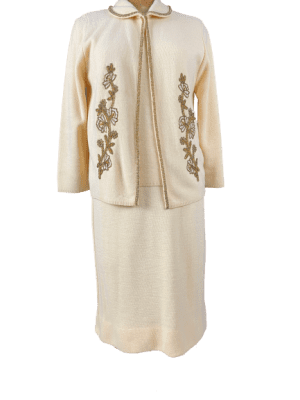 Orlon Acrylic 3 Piece knit suit – Cardigan/shell/top and skirt in buttery yellow.  Main photo is true to color.  Jacket has gold bead trim and embroidery embellishment, with one hood and eye closure at collar. Shell top is a pullover sleeveless scoop neck. A line Skirt has elasticated waist band and 3 inch hem. No flaws to note. In good Vintage Condition.
