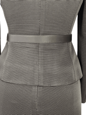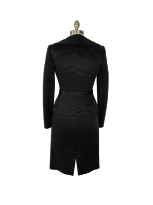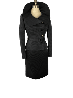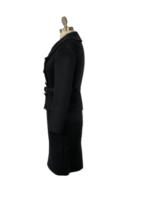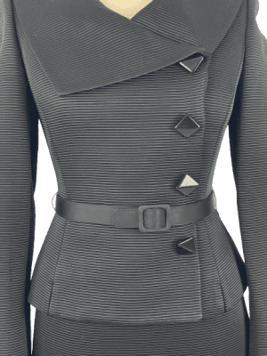 Black skirt suit set made with textured fabric. Jacket is silk lined with a wide collar, satin belt and faux buttons over covered press studs.