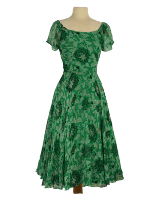 Vintage 50’s emerald green sheer silk chiffon printed dress with a scoop neckline, flutter sleeves, a full skirt /fully lined back zip closure. In good vintage condition. has a little tear at hemline. and a few stains on the lining.