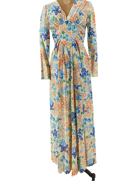 70s cream maxi dress, colorful floral print shot with gold lurex thread. V neckline leading into a circle over tummy gathering into the drop of the length. Long Sleeves and back zipper closure. No flaws to note – very good condition. – ILGWU.