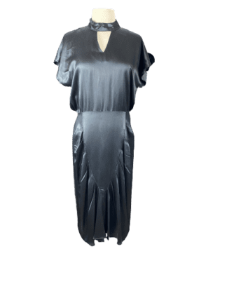 Slinky satin 80’s black cocktail dress. V cutout neckline and a V shaped panel with draping . Cap sleeve/ Back slit and zipper. ILGWU label.  A few minor flaws as shown, but still in good wearable condition.